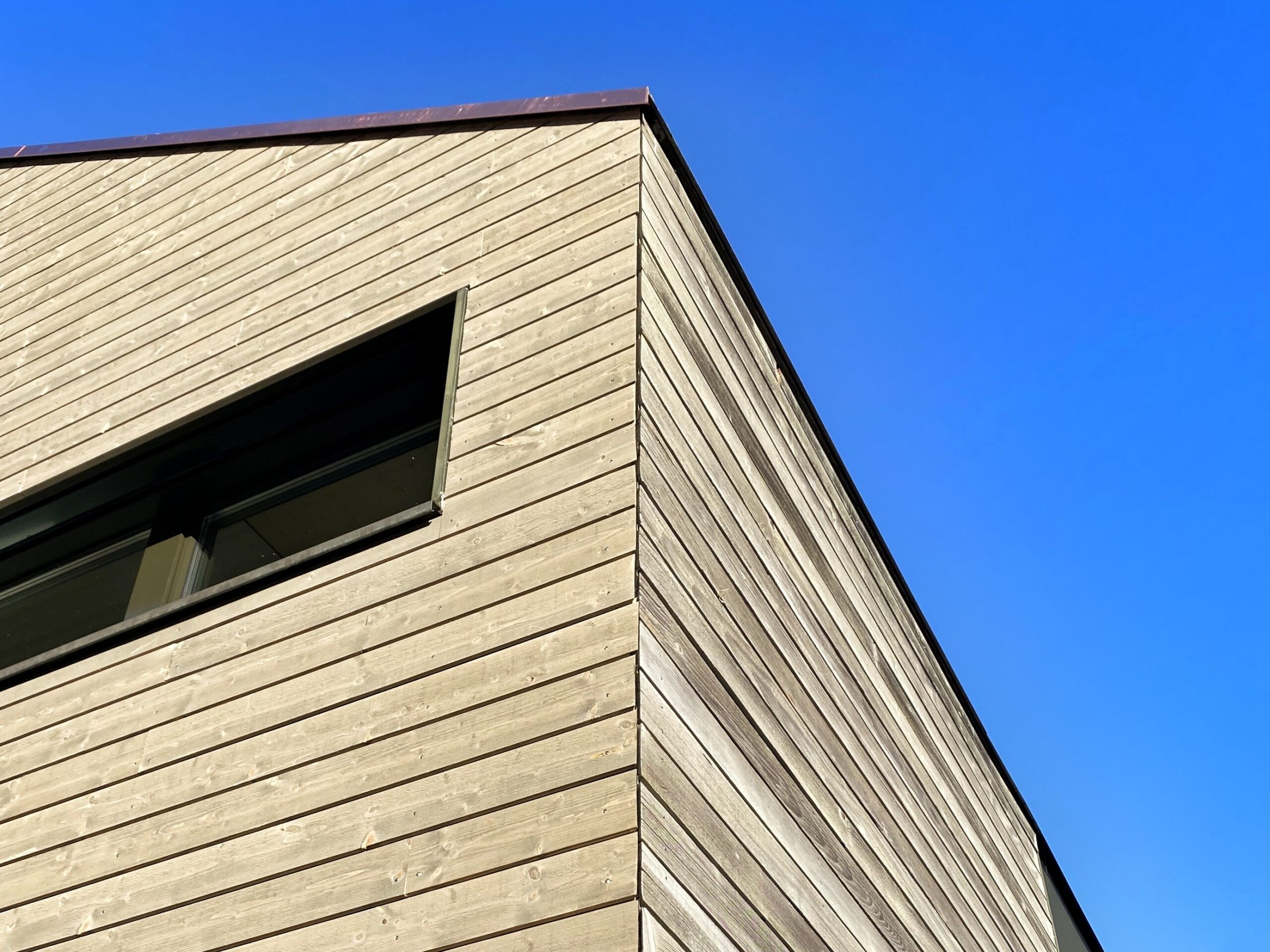 Der bescheidene Grundriss von 8x8 m auf zwei Ebenen wurde mit dem Anbau auf beiden Stockwerken um 50% erweitert. Das schuf Platz für zwei Zimmer, einen neuen Wohnraum und einen Veloraum. Die Fensterabschlüsse sind mit einbrennlackierten Alublechen umfasst und ergeben mit der vertikalen, vorvergrauten Fassade ein stimmiges Bild.